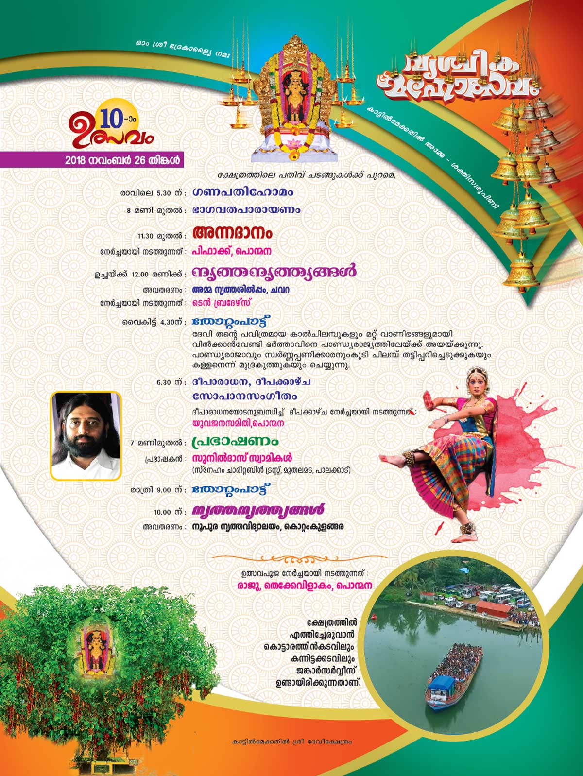 വൃശ്ചിക മഹോത്സവം 2018 നവംബർ 17 ശനിയാഴ്ച മുതൽ 2018 നവംബർ 28 ബുധനാഴ്ച വരെ. എല്ലാ ഭക്ത ജനങ്ങളേയും കാട്ടിൽ മേക്കതിൽ ശ്രീ ദേവീ ക്ഷേത്ര സന്നിധിയിലേക്ക് ദൈവീക നാമത്തിൽ സ്വാഗതം ചെയ്യുന്നു.