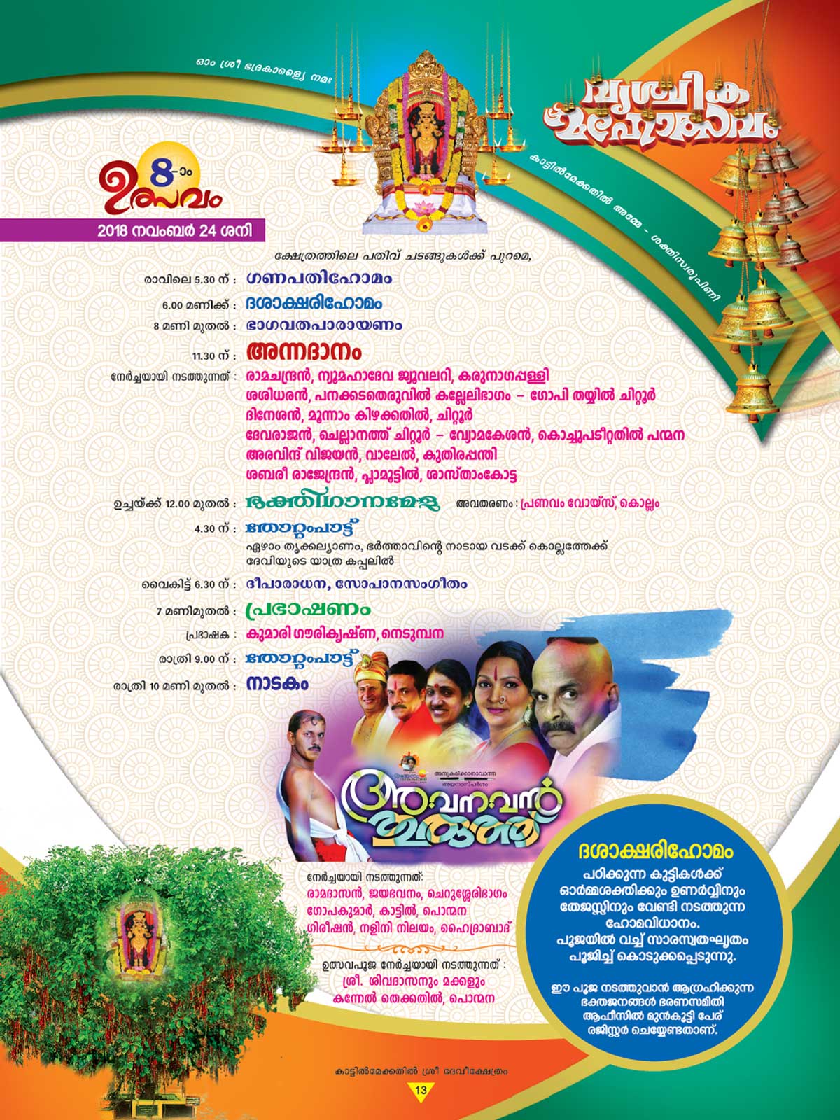 വൃശ്ചിക മഹോത്സവം 2018 നവംബർ 17 ശനിയാഴ്ച മുതൽ 2018 നവംബർ 28 ബുധനാഴ്ച വരെ. എല്ലാ ഭക്ത ജനങ്ങളേയും കാട്ടിൽ മേക്കതിൽ ശ്രീ ദേവീ ക്ഷേത്ര സന്നിധിയിലേക്ക് ദൈവീക നാമത്തിൽ സ്വാഗതം ചെയ്യുന്നു.